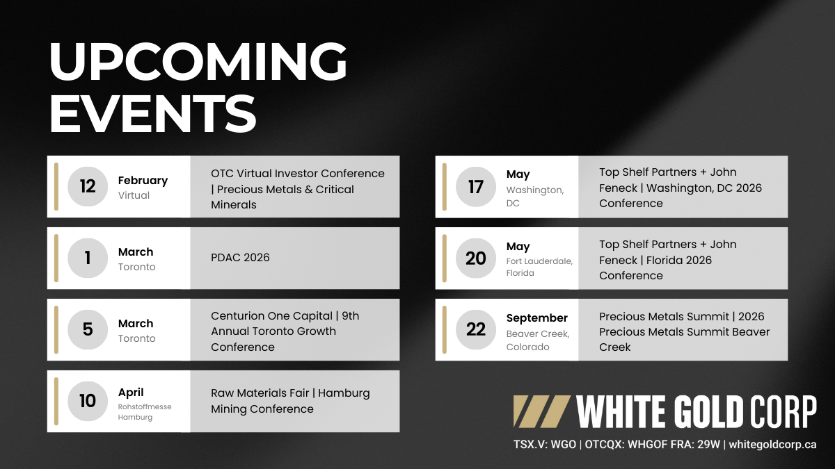 The Company owns a portfolio of 15,362 quartz claims across 21 properties covering 305,102 hectares (3,051 km2) representing approximately 40% of the Yukon’s emerging White Gold District. The Company’s flagship White Gold project hosts four near-surface gold deposits which collectively contain resource estimate of 1,732,300 ounces of gold in indicated resources (35.2 million tonnes grading 1.53 grams per tonne gold) and 1,265,900 ounces of gold in inferred resources (32.2 million tonnes grading 1.22 g/t Au) (see the Company's news release dated October 6, 2025)(1)(2). Regional exploration work has also produced several other new discoveries and prospective targets on the Company’s claim packages which border sizable gold discoveries including the Coffee project owned by Fuerte Metals with Measured and Indicated Resources of 80.0.2 Mt grading 1.15 g/t Au for 2.96 million ounces of gold, and Inferred Resources of 21.2 Mt grading 1.17 g/t Au for 0.80 million ounces gold(3)(2)(4), and Western Copper and Gold Corporation’s Casino project which has Measured and Indicated Resources of 2,490.7 Mt grading 0.18 g/t Au, 0.14% Cu for 14.8 million ounces of gold and 7.6 billion pounds of copper, and Inferred Resources of 1,412.5 Mt grading 0.14 g/t Au, 0.10% Cu for 6.3 million ounces of gold and 3.1 billion pounds of copper(5)(2)(4). For more information visit www.whitegoldcorp.ca.